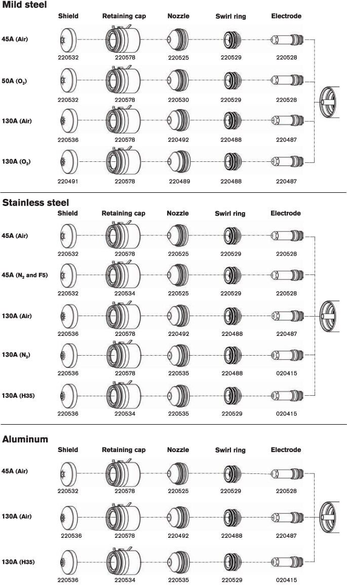 | Description | Kit contains all the necessary consumables and accessories for aluminum and stainless steel cutting at 130 A and below |